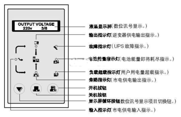 (2按一下關(guān)機(jī)按鍵后,可將ups逆變器關(guān)機(jī),改由市電旁路供電。此鍵主要作為ups日常開(kāi)關(guān)機(jī)使用。