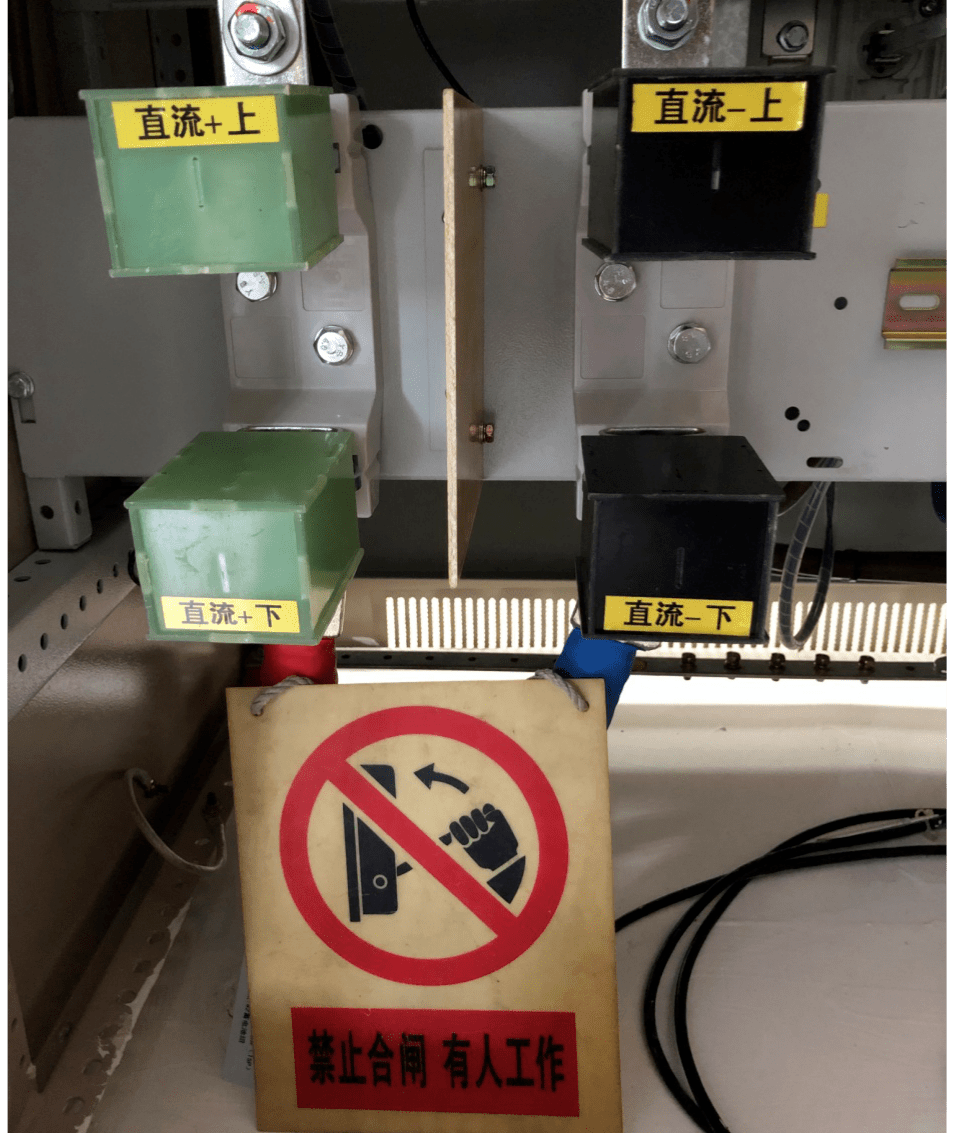 3. 取下蓄電池組保險后,在蓄電池保險的底座正極上下兩端、負(fù)極上下兩端分別套上大小合適的絕緣盒,并在絕緣盒上分別掛“禁止合閘,有人工作!”標(biāo)示牌。