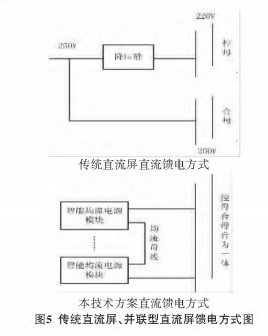 傳統直流屏控母和合母由于電壓不共同,負載要嚴格區別,比如,微機保護.指示燈等有必要接入控母,斷路器分合閘、儲能電機等負載有必要接人合母。本文所論述的技能控母和合母的電壓等級共同,并聯輸出,可互用,便利用戶的使用。傳統直流屏、并聯型直流屏饋電方法,如圖5所示。