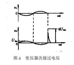另一方面,直流屏變壓器交流側也會由于大容量負載如大變比變壓器的合閘瞬間、其它負載堵截電源時以及整流變壓器電刀閘的開關斷開,也會由于初次級繞組間的分布電容,變壓器的鼓勵電流的驟變在次級產生瞬時過電壓,其尖峰值可達作業電壓峰值的6倍以上,如圖4所示。